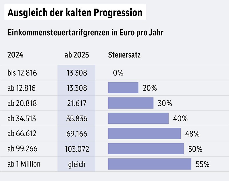 Die Anpassung der Tarifstufen erfolgt zu zwei Dritteln automatisch. Auf die Verteilung der übrigen Mehreinnahmen muss sich die Regierung einigen. Im Vorjahr kam das „variable Drittel“ vor allem niedrigen und mittleren Einkommen zugute.